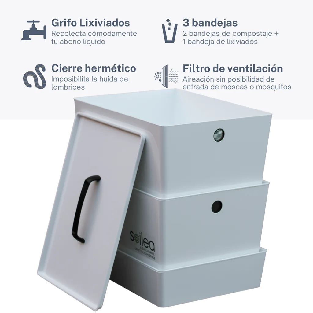 Filtro ventilación: El diseño hermético combinado con un orificio de ventilación único y con filtro incluido permite la correcta aireación a la vez que se impide tanto la huida de lombrices como la entrada de moscas y mosquitos.