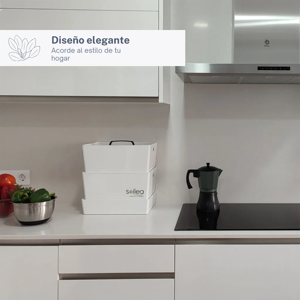 Aspecto agradable: A diferencia de la gran mayoría de los compostadores, nuestros modelos cuidan el diseño al detalle para encajar perfectamente en cualquier estancia de una vivienda y formar parte del mobiliario sin romper la estética del lugar en la que se encuentra.