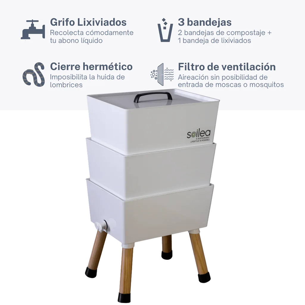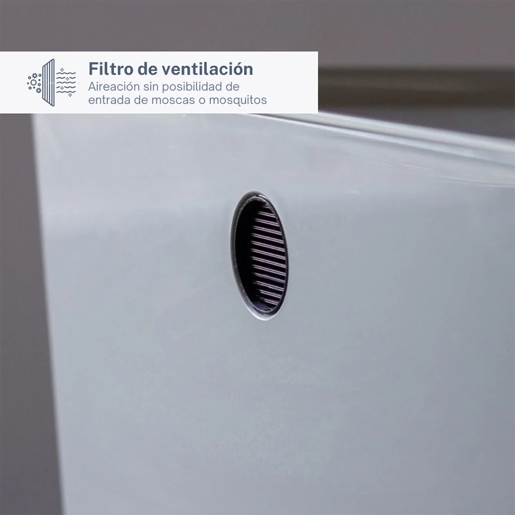 Filtro ventilación: El diseño hermético combinado con un orificio de ventilación único y con filtro incluido permite la correcta aireación a la vez que se impide tanto la huida de lombrices como la entrada de moscas y mosquitos.