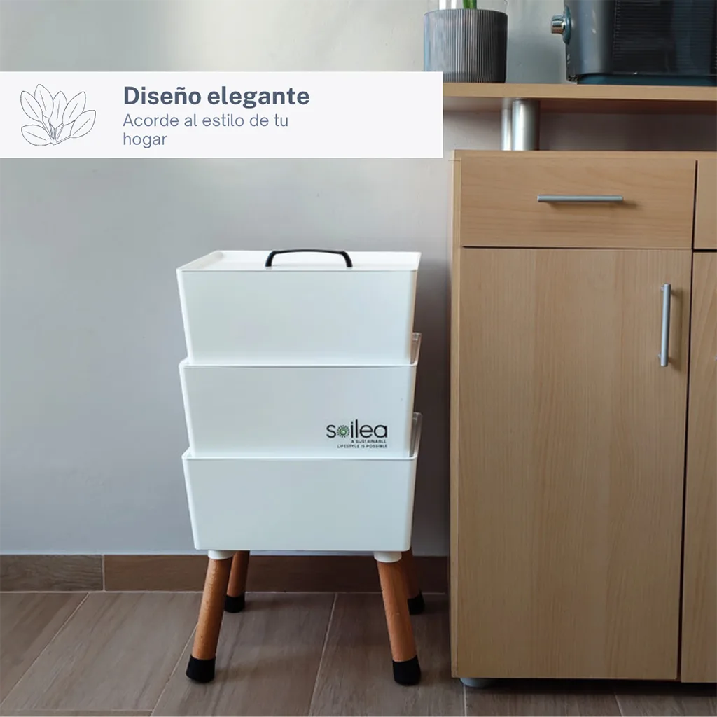 Aspecto agradable: A diferencia de la gran mayoría de los compostadores, nuestros modelos cuidan el diseño al detalle para encajar perfectamente en cualquier estancia de una vivienda y formar parte del mobiliario sin romper la estética del lugar en la que se encuentra.