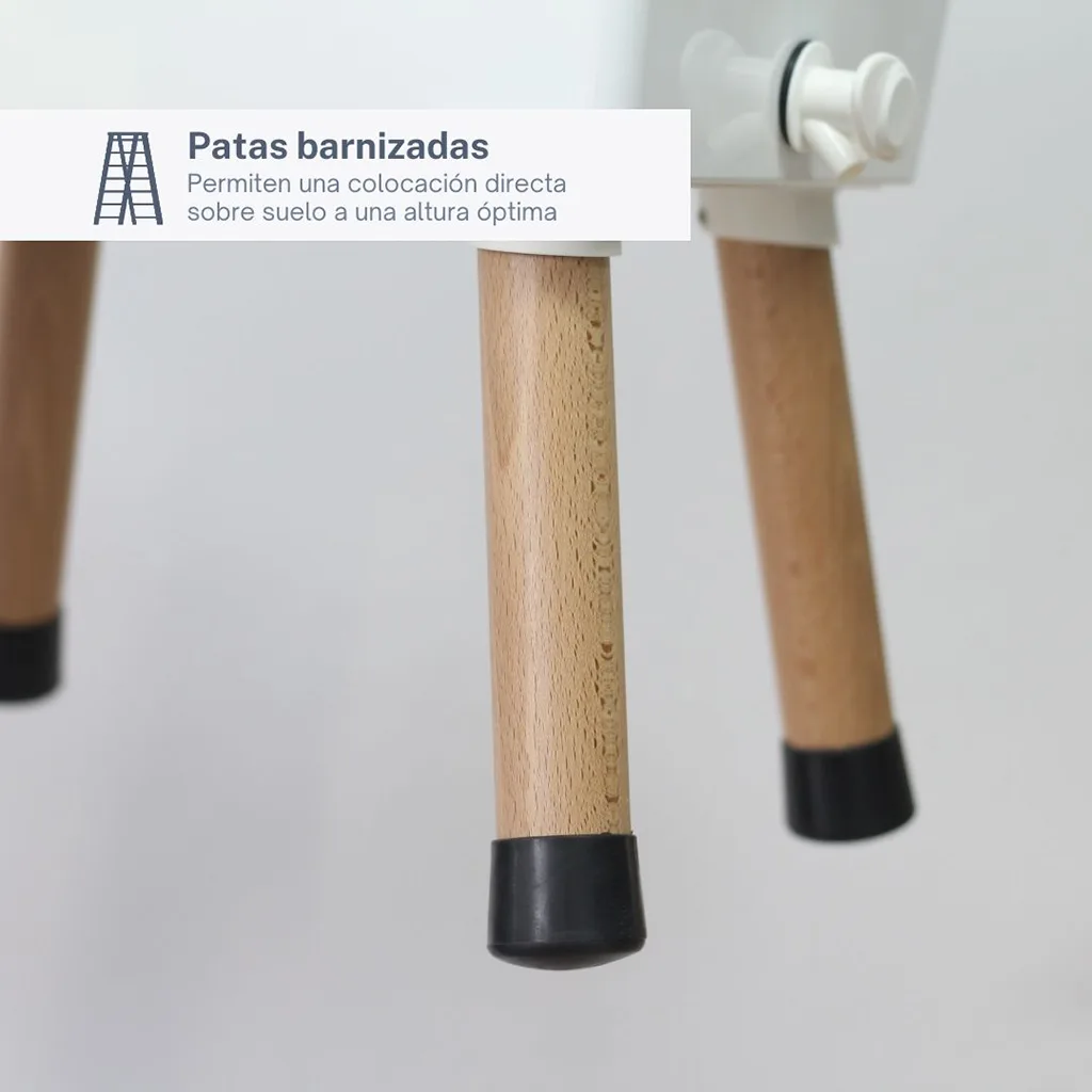 Patas elegantes y duraderas: La versión StandUp cuenta con 4 patas sobre las que posar el vermicompostador. Fabricadas en madera de pino cepillada y barnizada, no solo dan un aspecto elegante sino que su larga duración está garantizada.