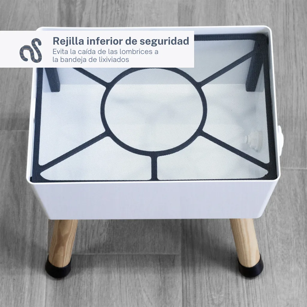 Rejilla anti-caída: Es habitual que durante los primeros días multitud de lombrices caigan en la bandeja de lixiviados y mueran. Para evitar esto, hemos colocado una rejilla ajustada entre las bandejas de compost y la de lixiviados que permite que el paso del líquido pero no el de lombrices.